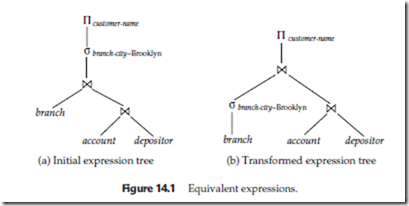 which is equivalent to our original algebra expression, but which generates smaller intermediate relations. Figure 14.1 depicts the initial and transformed expressions.
