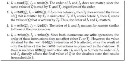 Let us consider a schedule S in which there are two consecutive instructions Ii and Ij , of transactions Ti and Tj , respectively (i j= j). If Ii and Ij refer to different data items, then we can swap Ii and Ij without affecting the results of any instruction in the schedule. However, if Ii and Ij refer to the same data item Q, then the order of the two steps may matter. Since we are dealing with only read and write instructions,